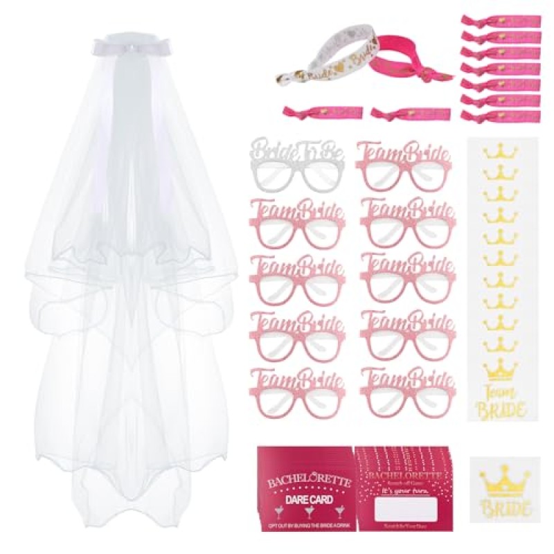 - 54 pieces including veil, bride and team glasses, wristbands, cards, and gold tattoos