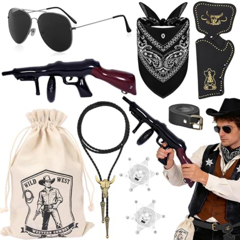 - Includes 9 pieces: sunglasses, paisley bandanna, western-style holster, belt, bolo tie necklace, 2 sheriff badges, cowboy drawstring bag, inflatable prop
