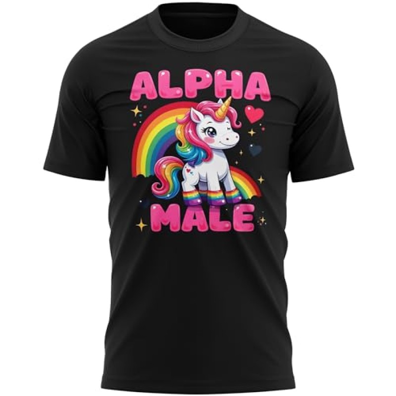 - Bold Alpha Male slogan alongside a whimsical rainbow unicorn graphic