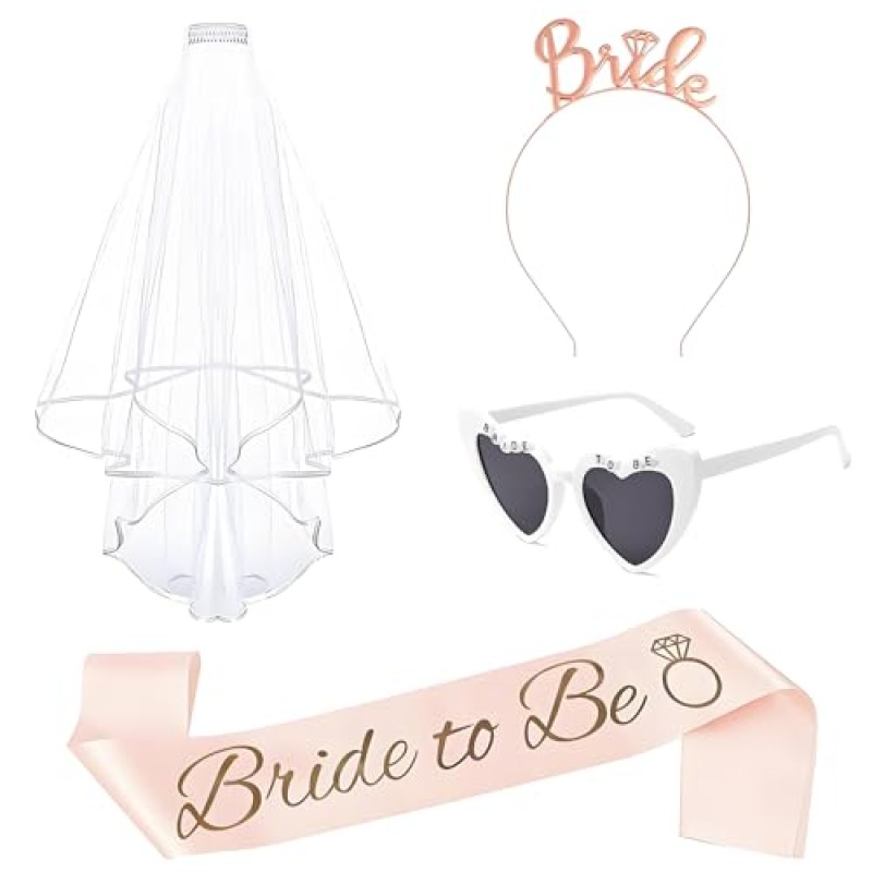 - Includes rose gold satin sash, white veil with comb, metal alloy tiara, and plastic heart-shaped sunglasses
