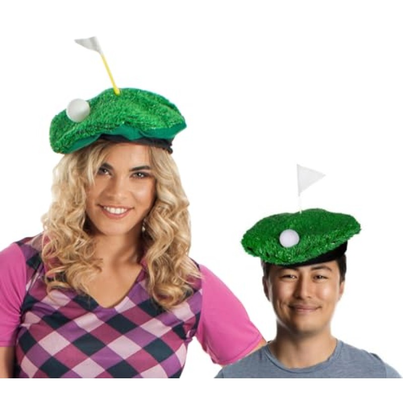 - Fancy dress golf hat with detailed green faux grass, white flag, and golf ball